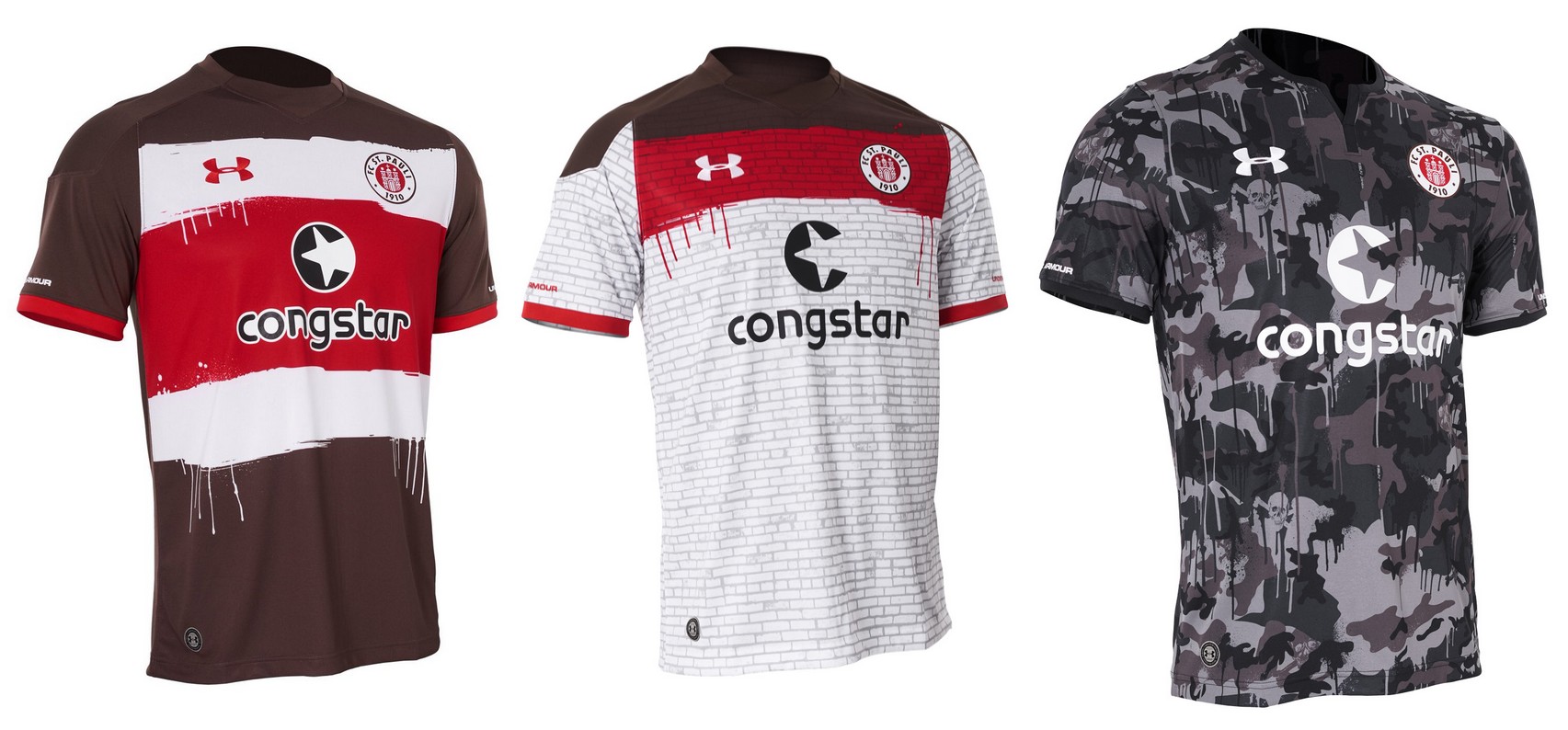 St Pauli är ett "poplag" från Hamburg. Trots att de oftast håller till i Bundesliga 2 så har de många fans, och deras tröjor brukar alltid vara lite speciella. Bara att man har en hemmatröja som går i brunt är inte så vanligt. Under Armour har fått fram tre riktigt fräcka tröjor men mönster av rinnande färg. Kul!