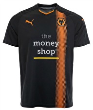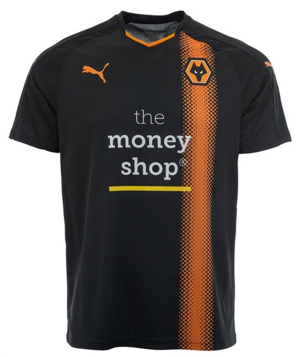 Att Wolverhampton kommer med en svart andratröja hör inte till ovanligheterna, men det är faktiskt Pumas första svarta bortatröja sedan de tog över tillverkningen 2013. Puma har axelband i någon lämplig färg i prickform. Här har man satt detta "prickband" på vänster bröstsida. Riktigt effektfullt och snyggt.