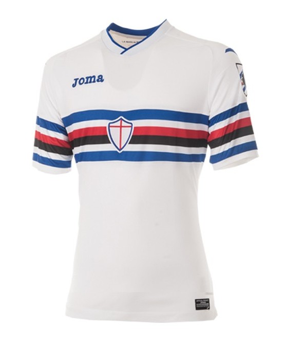 När det gäller Sampdorias bortatröja så är den alltid vit eller vid något enstaka tillfälle svart. Tröjan har också Sampdorias blå, svarta och röda rand över bröstet. Klubbmärket har flyttat över på ärmen och det är det som är lite nytt. På insidan av kragen står: “La maglia più bella del mondo” vilket betyder "Den vackraste fotbollströjan i världen". Det håller jag inte med om.