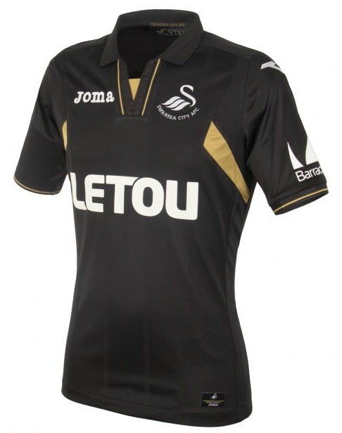 Swansea har ofta rena vita hemmatröjor. Däremot brukar andra och tredjetröjorna ha blandade färger och mönster. Andratröjan är röd och tredjetröjan har blivit svart med vita och guldinslag. Joma har fått ett intressant stuk på hals och krage. Ganska snyggt, men så finns det en sak som förstör allt. Just det! Sponsorn. Ett spelbolag. Fy!