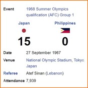 Japan hade gjort ganska bra ifrån sig i OS-turneringen 1964 genom att nå kvartsfinalen. De förlorade mot finalisten och tvåan Tjeckoslovakien. Det förväntades att Japan skulle kunna kvala in till OS i Mexiko City 1968 ganska enkelt. Kvalet började idag 1967 med första matchen mot Filippinerna i Tokyo. Och det gick verkligen lätt. Japan tog sin allra största seger i historien genom vinst med 15-0. Visst tog sig Japan till OS där de senare vann matchen om tredje pris mot värdnationen Mexico med 2-0 och tog brons.