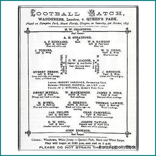 På Hampden Park i Glasgow möttes idag skottska Queen's Park FC och engelska Wanderers FC. Skottarna hade inga problem att vinna. 5-0 slutade matchen. Det speciella med dagens match 1875 var att det var första gången i historien som det såldes ett matchprogram. Programmet bestod i ett enda blad där man kunde läsa datum, plats och laguppställningar för de båda lagen. Det fanns också en uppmaning till publiken ”Var vänliga och häng inte på repen”.
