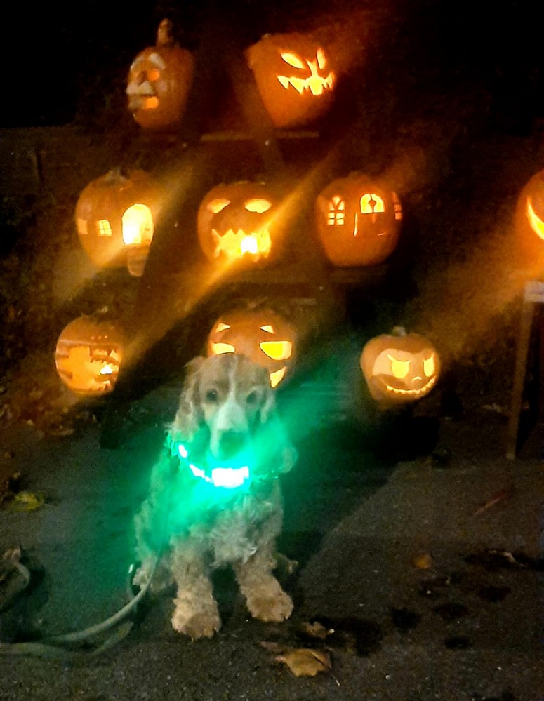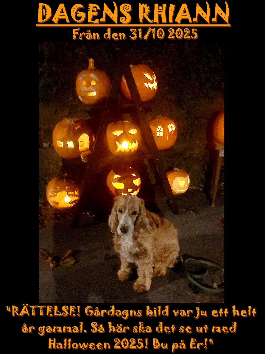 Då var oktober över. Den sista brukar det bli fullt hålligång på dörrklockan. Sedan som irländarna förde med sig till Amerika och som blivit en av de största helgerna i USA har även Sverige tagit över denna festlighet. Det startade på 1990-talet och det riktiga Halloween är den 31:a oktober. Etikettexperten Mats Danielsson har förklarat att han anser Halloween ska firas fredagen innan Allhelgonadagen. I år så stämmer allt överens. Vad som inte stämde överens var antalet godis som var köpt hem. Det tog slut och dottern fixade popcorn till de sista. I år hade vi ställt ut alla våra pumpor på gatan så det var fritt fram för alla sällskap att våga sig in till en av våra ytterdörrar och ringa på. De första var av det yngre slaget och dessa skrämde Rhiann då hon i glädjen över att det kom något skällde ut dem. Då Rhiann stod för buset så fick v stå för godiset. De sista som kom var pojkar i målbrottet och som var lika långa som jag själv, 193 cm.