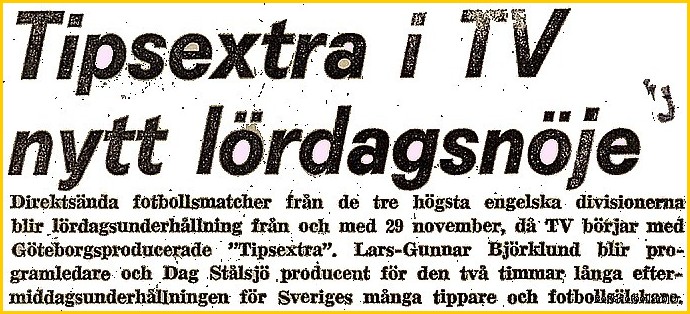 Lars-Gunnar Björklund var en sportjournalist som jobbade på Sveriges Television. Han hade en vision om att kunna visa engelsk ligafotboll direkt i TV på lördageftermiddagar där det samtidigt skulle kunna gå att få direkt rapportering om de andra matcherna på tipset och på så sätt kunna presentera den rätta tipsraden. Detta jobbade han på och fick myndigheterna i Sverige att gå med på detta. Han fick ett engelskt Tv-bolag från Midlands att sända matcherna, så de första åren visades bara matcher med lag från mellersta England som hemmalag.