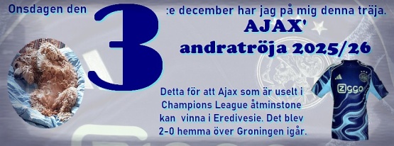 Andra dagen i december ar den första lik. Ganska fint väder. Hade inte klubborna varit avställda så skulle det nästan ha fungerat att spela golf. Fast rörelseschemat sträckte sig till några hundpromenader. Kalendrar öppnades och det blev två te och en kaffe. Jag har ju två kaffekalendrar, men igår så fick det räcka med en. Det går ju bra att öppna den fiktiva luckan och se vilket kaffe som var i gårdagens påse, men sedan kan man ju spara den till en bättre dag. Juldagen t ex.